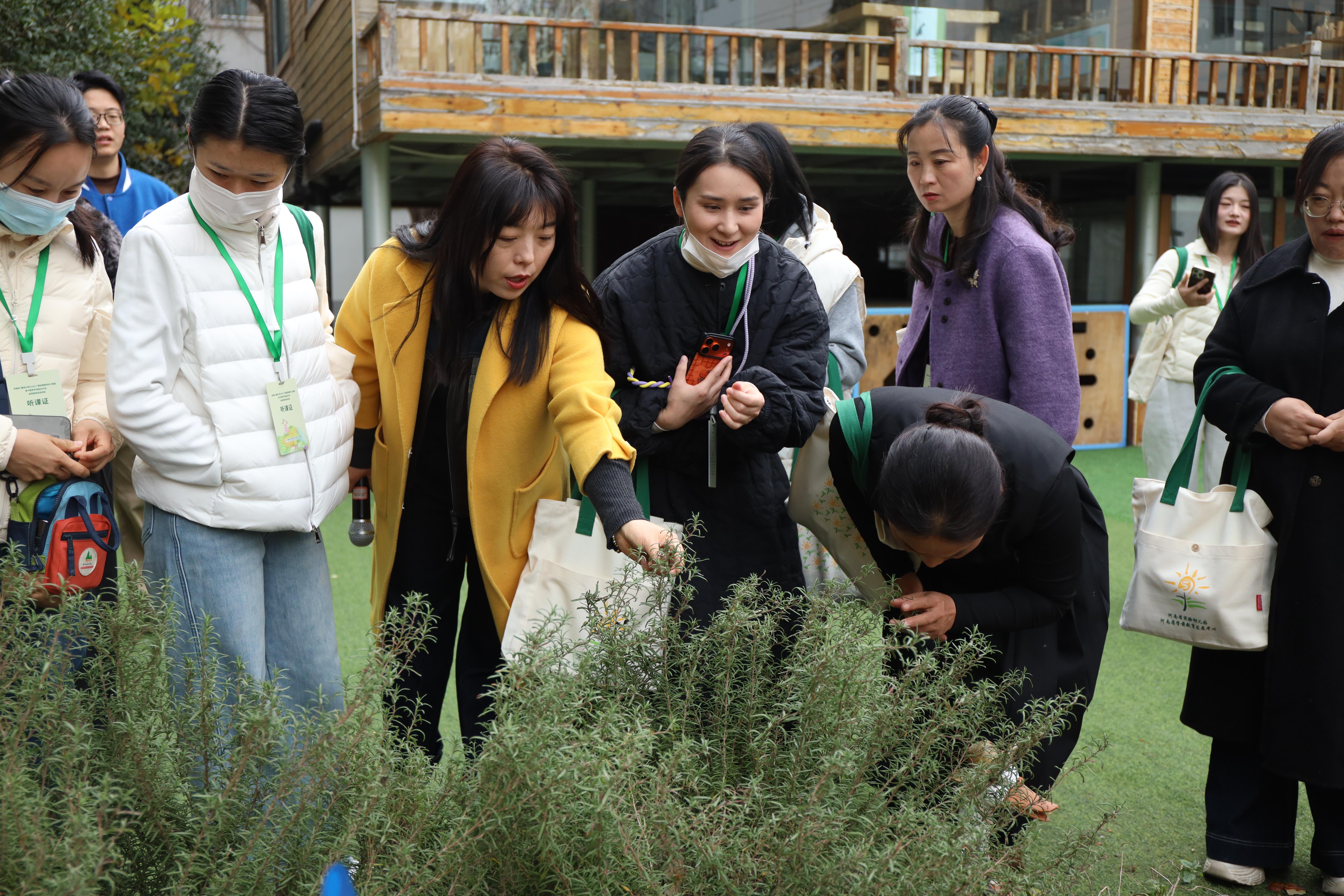 姚海平老师则是把《种植,食育的源头活水》的课堂直接搬到了幼儿园的蔬果花园中。学员们带着“探秘”任务观察植物、思考课程生成。回到教室后,姚海平用照片和故事揭晓百草园从人造景观到育人课堂的蜕变过程。