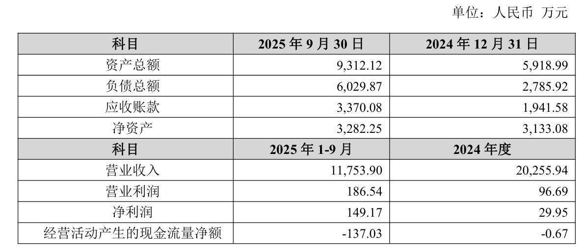 财务数据显示,2024年及2025年前三季度,宾得利营业收入分别为2.03亿元、1.18亿元,净利润仅29.95万元、149.17万元,经营性现金流持续为负。截至2025年9月末,该公司净资产为3282.25万元,应收账款达3370.08万元,后者已超出前者。
